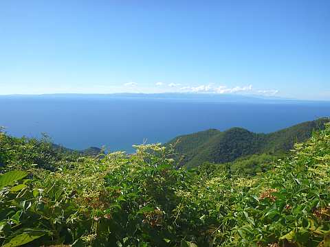 向こうに佐渡島が見えます。