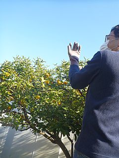 秋菜が柚子の収穫にきました。