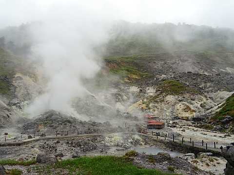 道の脇には地熱のある岩場や玉川温泉の源泉「
