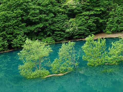 通常は湖畔に立つ木々が、雪解けによる湖水の水位上昇に伴い、