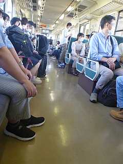 なんば、朝6時のバスは補助席まで使用の満員。