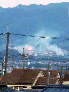 川西駅まで歩き。山の方が燃えてます。