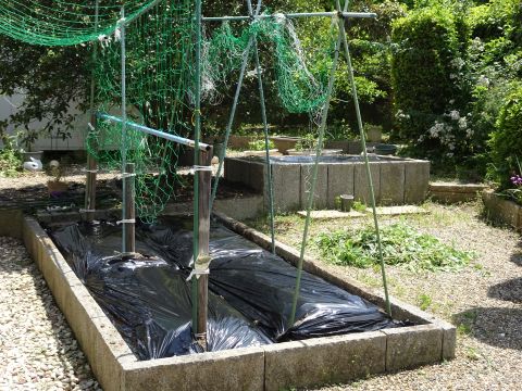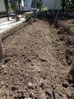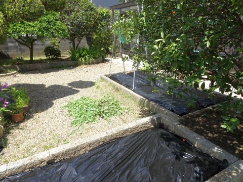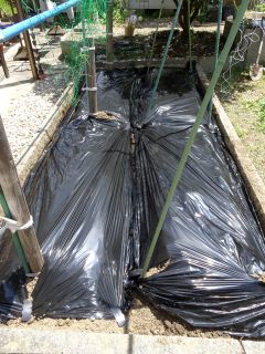 庭の畑に畝を作ってマルチをかけた。