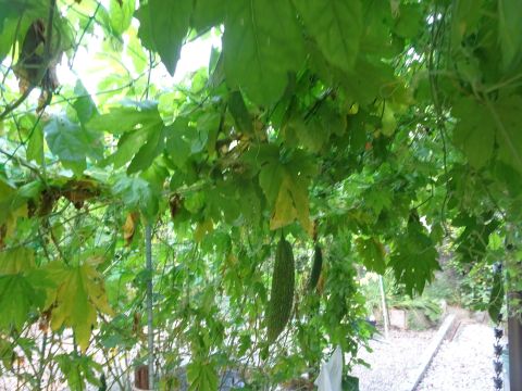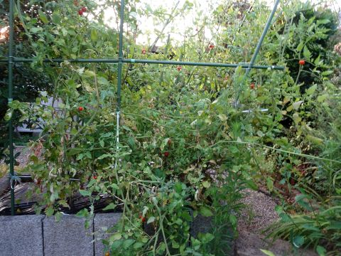 家庭菜園の様子。野菜も暑すぎてヘロヘロ。