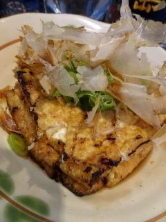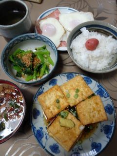 朝ごはん、厚揚げの消費期限が切れそうなので焼いてみた。