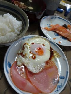 朝ごはん。親父も同じの食べてる。