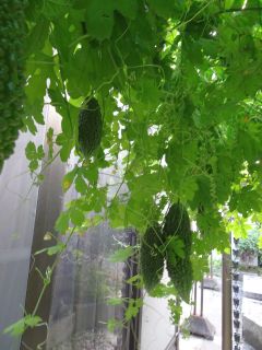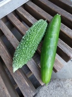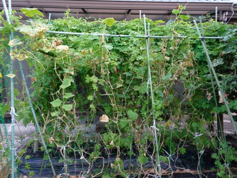 家庭菜園の様子。ゴーヤはすぐ黄色くなります。