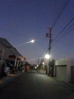キレイな朝日。月がまだ西の空に出ています。